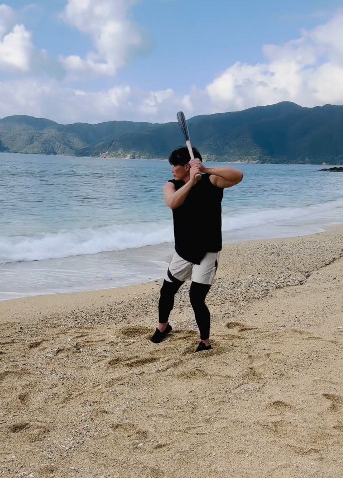 動画には、無人島の砂浜と船の上でバットを振る様子が収められている。